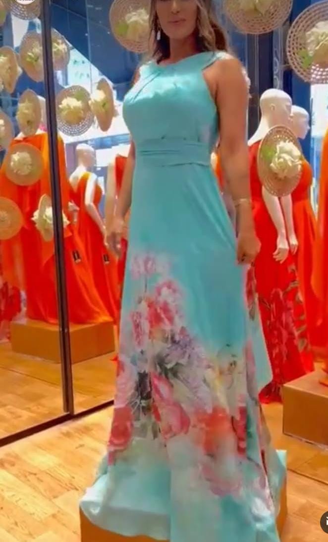 Vestido longo, estampa floral sem mangas, com capa solta nas costas