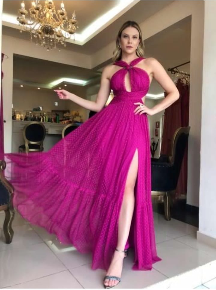 Vestido longo com fenda lateral e busto com alça cruzada, tule em poá